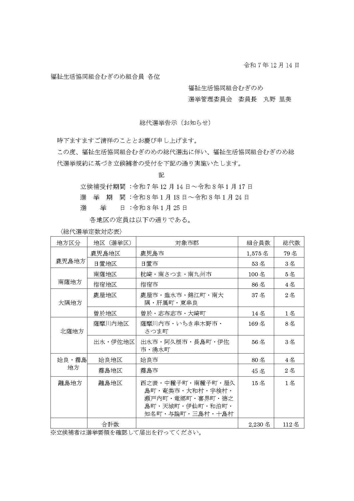 組合員の皆様におかれましては、ますますご清祥のこととお慶び申し上げます。 この度、福祉生活協同組合むぎのめでは、総代選挙規約に基づき総代選挙を実施いたします。 つきましては、令和7年12月14日より立候補者の受付を開始いたしました。